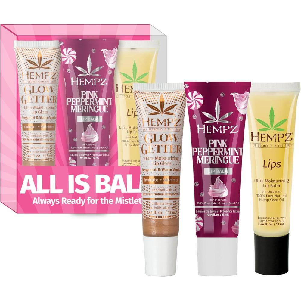 Offer Includes: – Glow Getter Lip Gloss .44 fl. oz. – Pink Peppermint Meringue Lip Balm .44 fl.oz. – Ultra Moisturizing Lip Balm .44 fl.oz
