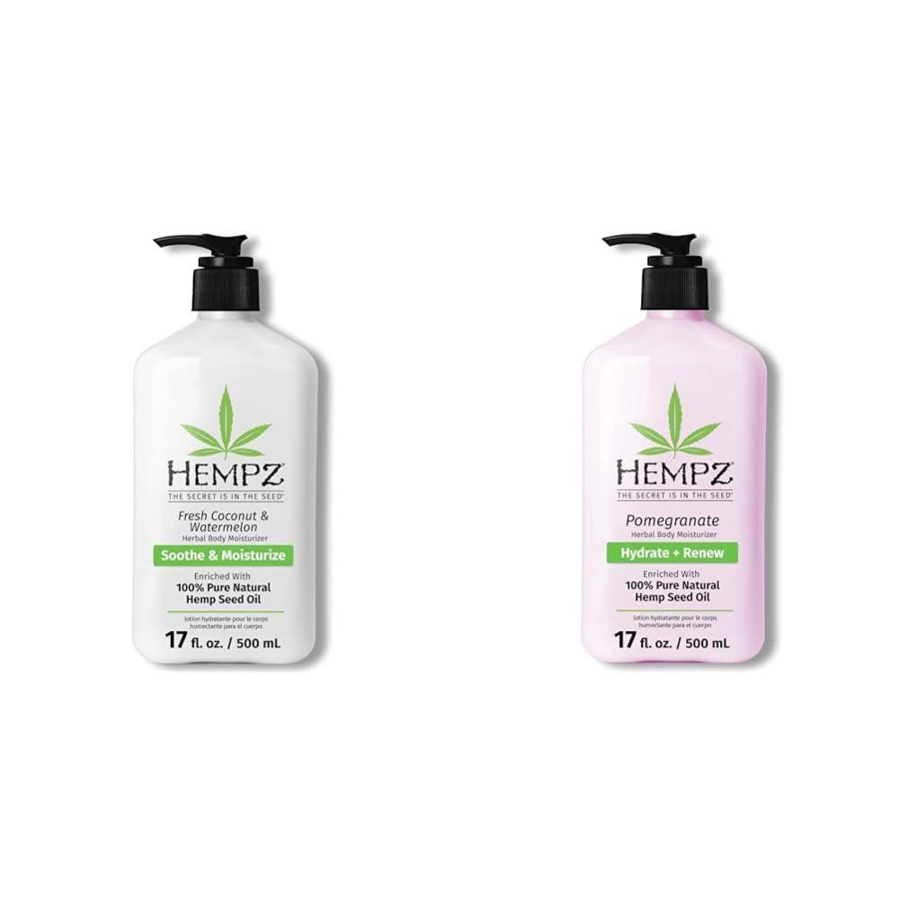 The Hempz body lotion bundle includes a 17oz tub of Hempz Fresh Coconut & Watermelon daily moisturizing body lotion and a 17oz tub of Hempz Pomegranate citrus daily moisturizing body lotion. Both body lotions feature natural hemp seed oil enriched with vitamins and fatty acids to nourish skin. The Fresh Coconut & Watermelon lotion contains coconut oil, watermelon extract, shea butter, aloe, and avocado oil to provide lightweight hydration and condition skin. It has a fresh coconut and watermelon scent. The Pomegranate Citrus lotion contains pomegranate extract to renew skin radiance along with essential vitamins, proteins and minerals. It has a bright citrus scent. Together these complementary scented body lotions provide intense hydration and nutrients to nourish skin while the lightweight formulas absorb quickly without greasiness. The cruelty-free, vegan and gluten-free moisturizing lotions can be used daily by all skin types.