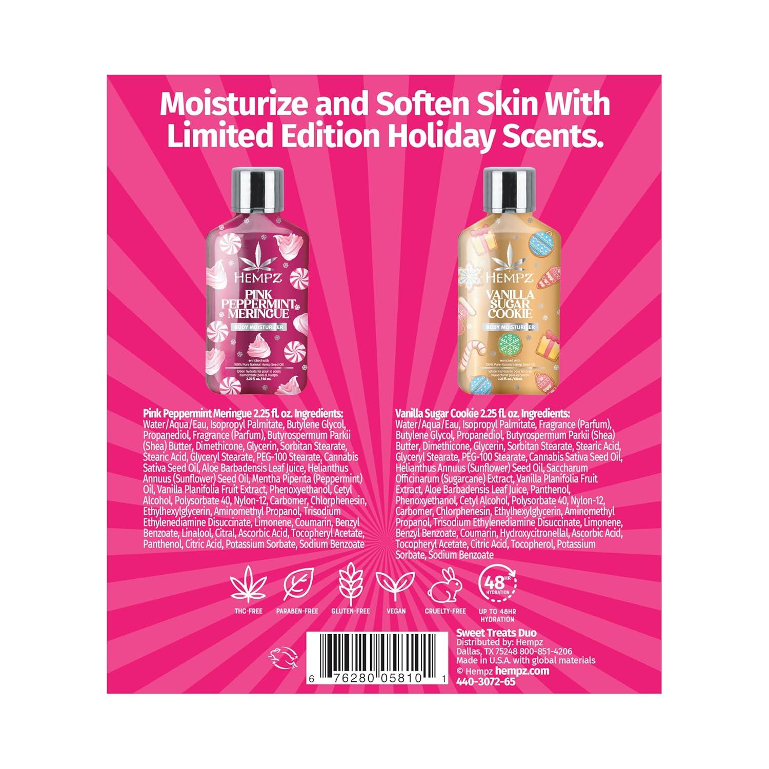 Offer Includes: – Mini Pink Peppermint Meringue Body Moisturizer 2.25 fl.oz. – Mini Vanilla Sugar Cookie Body Moisturizer 2.25 fl.oz.