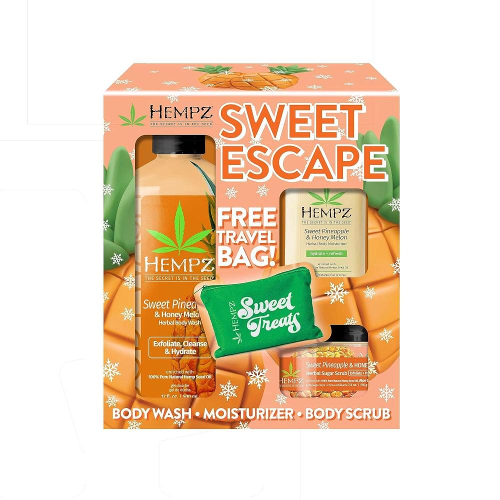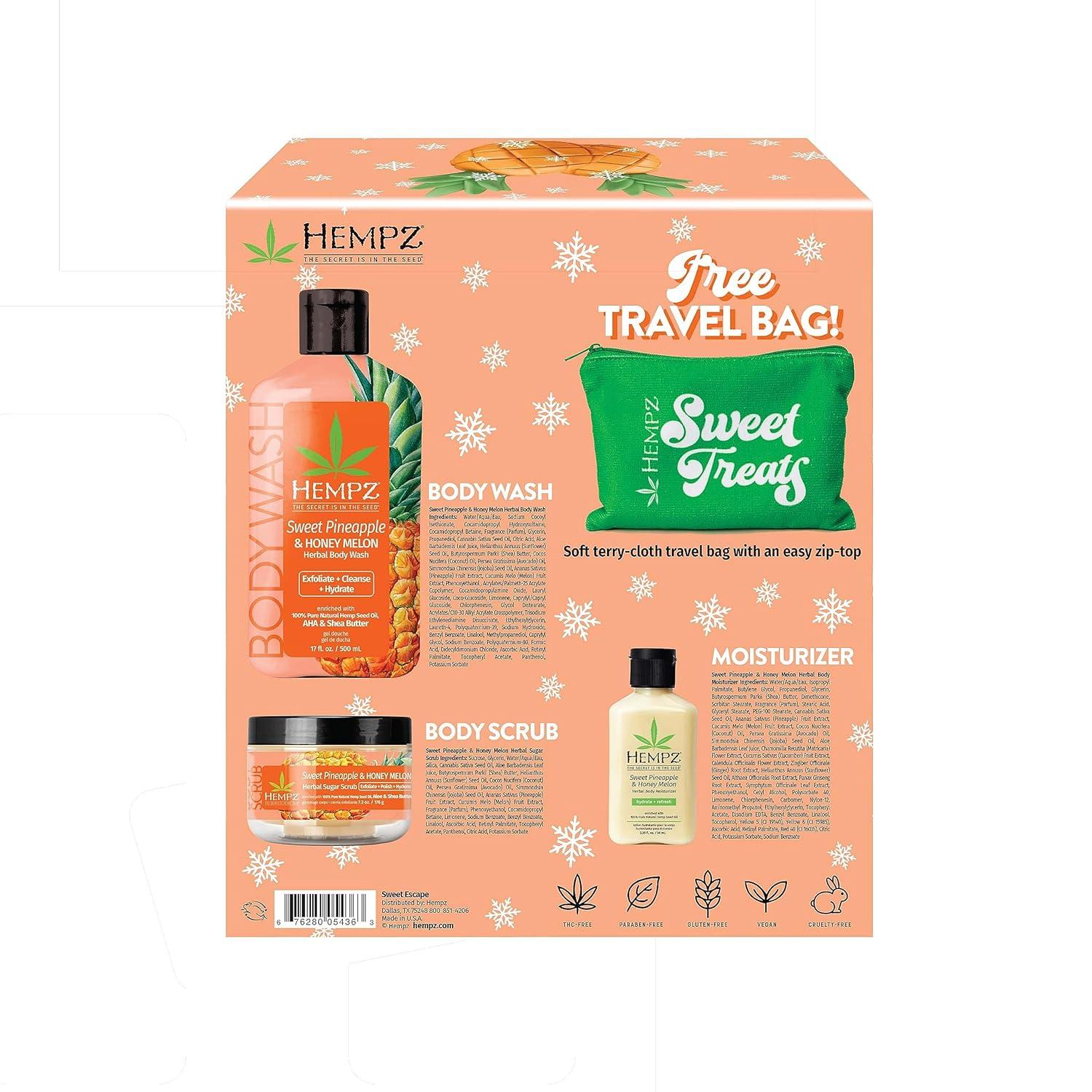 Holiday essentials skin care – contains one travel bag with sweet pineapple & honey melon herbal moisturizing body wash (17 Oz), body scrub (7.3 Oz), & lotion (1.25 Oz) made with 100% hemp seed oil rich in omega fatty acids to keep your skin healthy & glowing