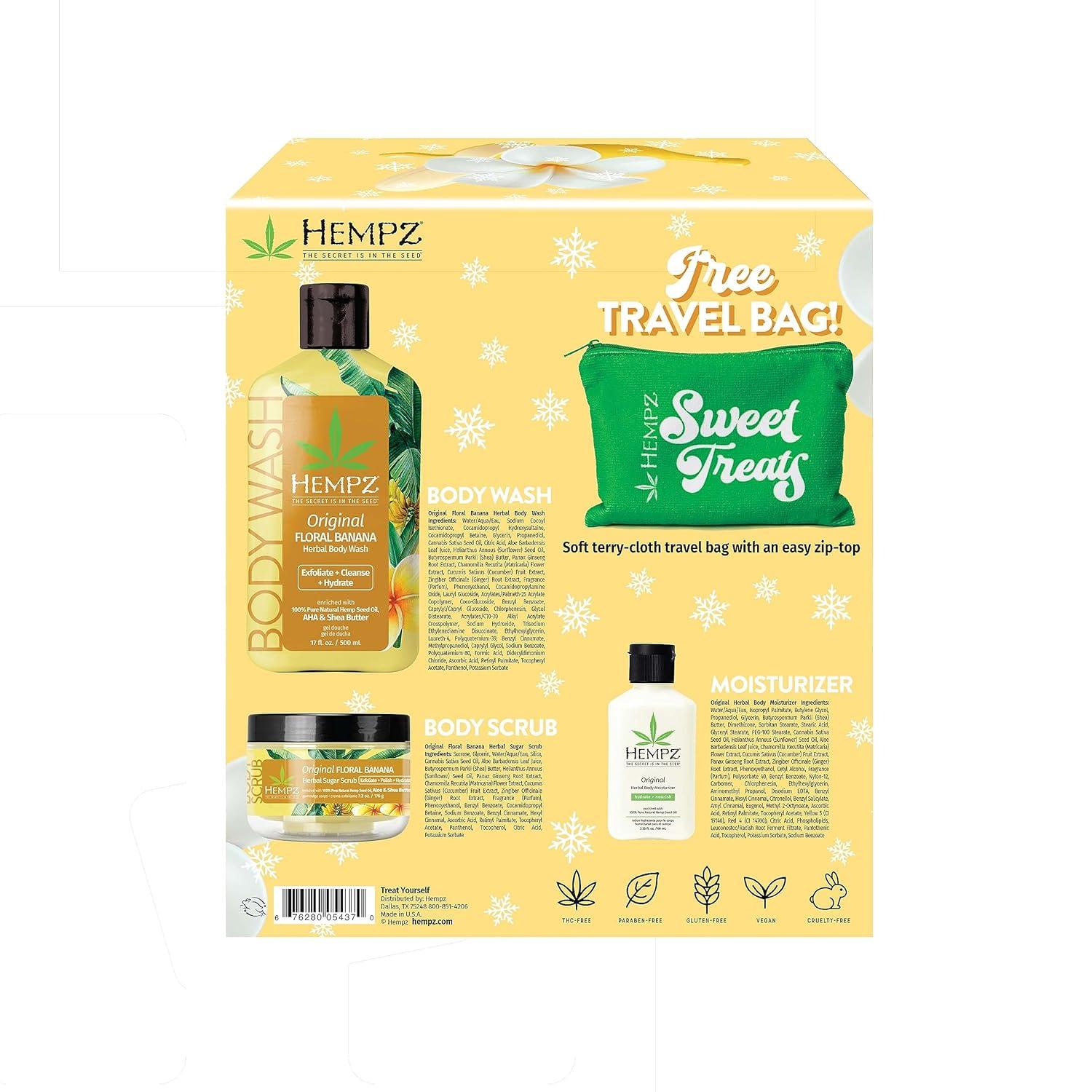 Holiday essentials bath & shower – contains one travel bag with floral banana herbal moisturizing body wash (17 Oz), body scrub (7.3 Oz), & moisturizer (1.25 Oz) made with 100% hemp seed oil rich in omega fatty acids to keep your skin healthy & glowing